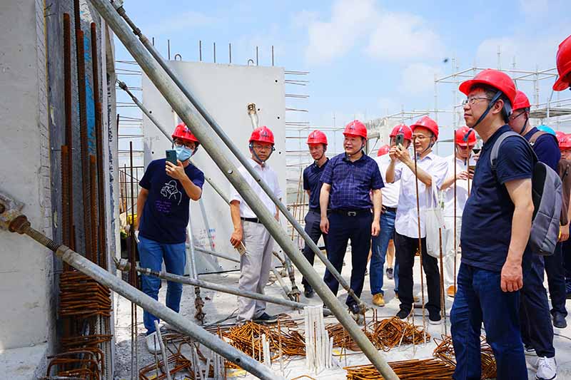當(dāng)天上午,調(diào)研團(tuán)領(lǐng)導(dǎo)一行首先來到位于上海市閔行區(qū)七寶鎮(zhèn)的古美北社區(qū)S110501單元27-01地塊項(xiàng)目施工現(xiàn)場(chǎng)進(jìn)行實(shí)地參觀考察,董事長(zhǎng)李軍全稱陪同。該項(xiàng)目為裝配整體式剪力墻結(jié)構(gòu)住宅工程,由上海旭融房地產(chǎn)開發(fā)有限公司開發(fā),通州建總集團(tuán)有限公司施工總承包,錦蕭科技承接該項(xiàng)目PC構(gòu)件生產(chǎn)供貨并提供裝配指導(dǎo)安裝服務(wù)。