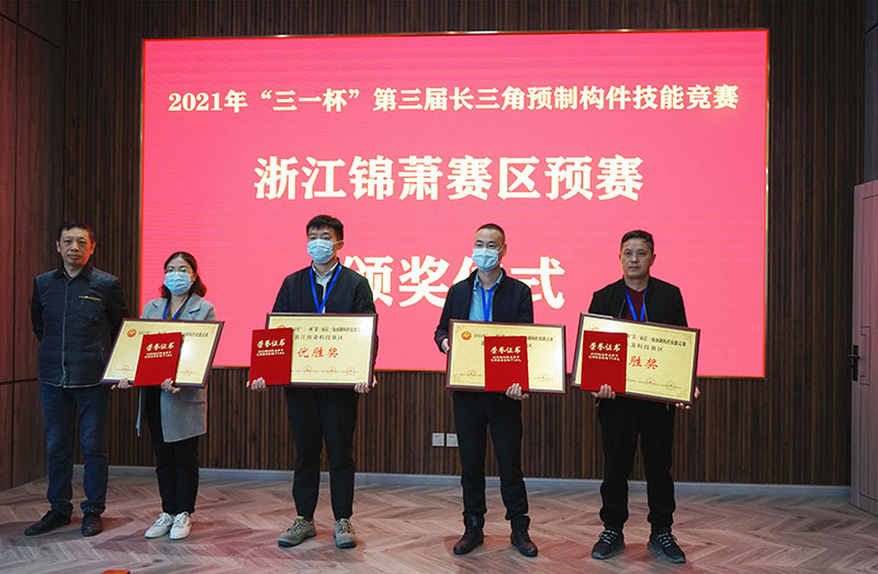 經(jīng)過激勵(lì)的角逐,最終浙江永堅(jiān)新材料科技股份有限公司,錦蕭建筑科技有限公司,浙江建楓裝配式建筑科技有限公司參賽隊(duì)表現(xiàn)突出,拿下比賽前三。賽后,作為承辦方,錦蕭科技總工程師王建忠分別為獲獎(jiǎng)參賽隊(duì)頒發(fā)了榮譽(yù)證書,同時(shí)獲得前三的參賽隊(duì)成員也將獲得由海鹽縣人力資源和社會保障局給予的獎(jiǎng)金獎(jiǎng)勵(lì)。