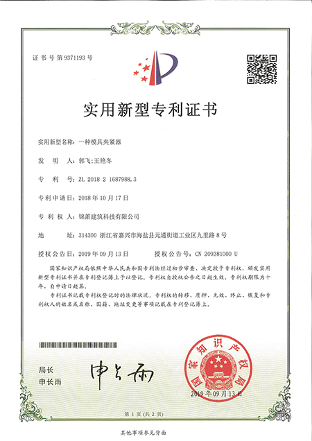 專(zhuān)利證書(shū)--一種模具鋼筋定位工裝